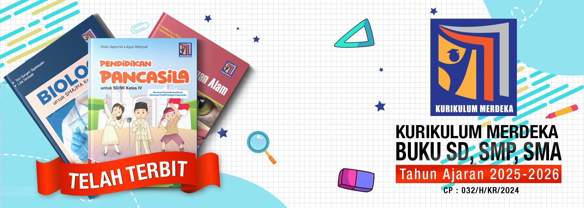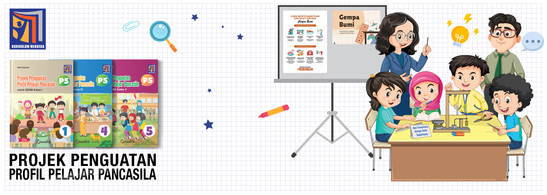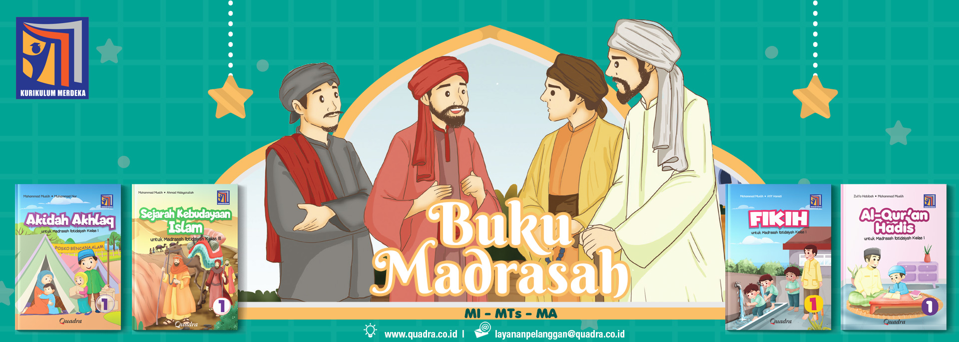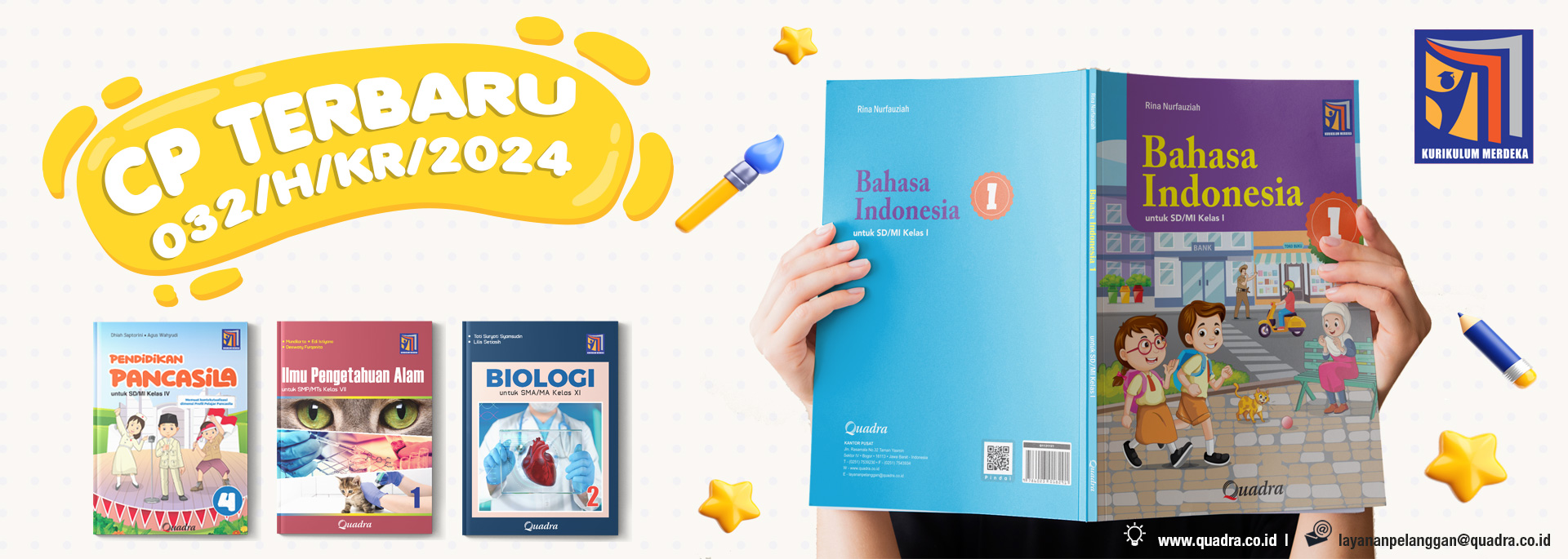 Semua jenis buku teks pelajaran berupa buku-buku bidang sains, sosial dan humaniora diterbitkan oleh Quadra, mulai dari jenjang SD, SMP dan SMA, Materi ajar disusun sesuai kurikulum berlaku, yaitu Capaian Pembelajaran (CP) nomer : 032/H/KR/2024 pada Kurikulum Merdeka. Baik buku siswa, buku kerja maupun buku guru. Quadra juga menerbitkan buku-buku pengayaan di bidang komputer dan pendidikan moral bagi anak usia dini.